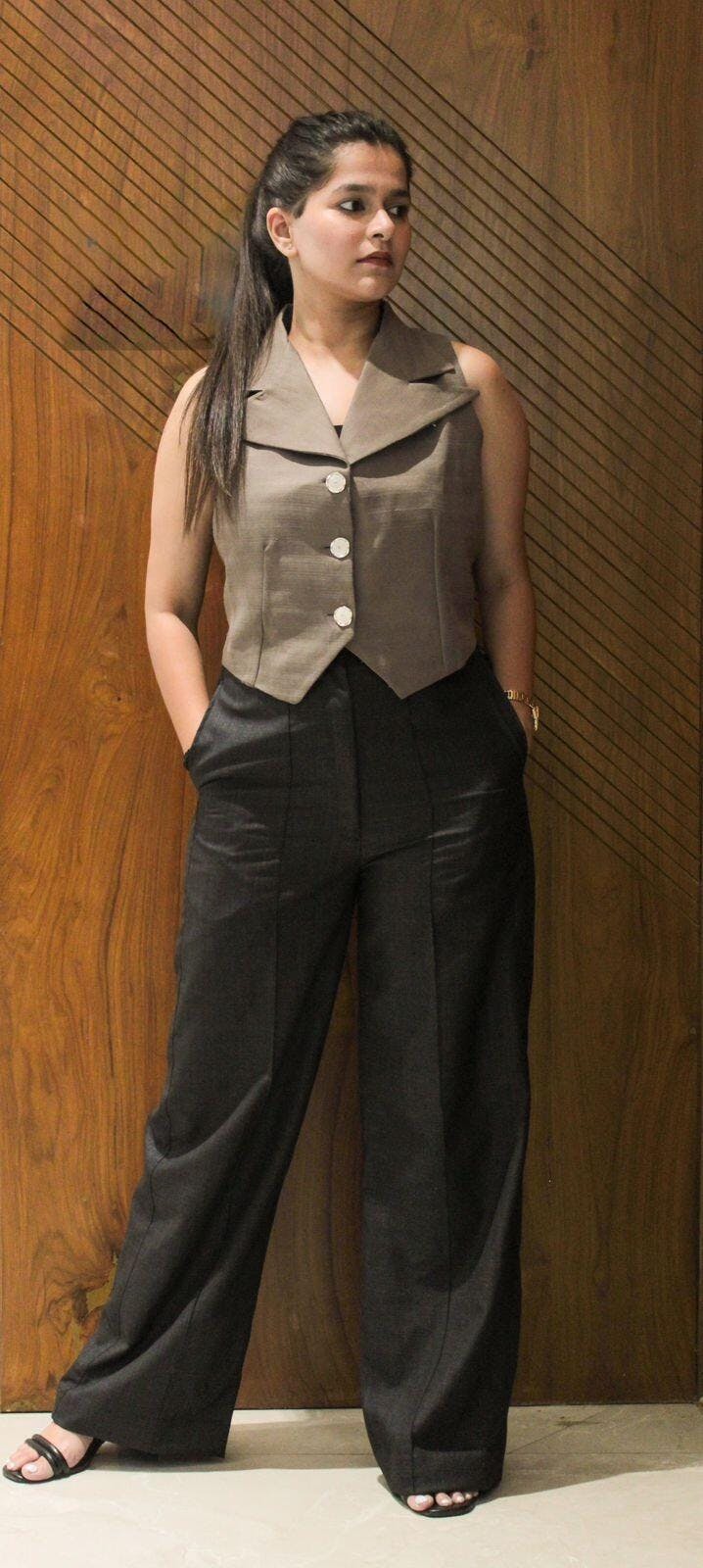 The waistcoat and pants of the Carbon Black set can each be styled in multiple independent ways, making them true wardrobe essentials. The waistcoat looks sharp layered over a crisp white shirt or turtleneck, paired with jeans or a skirt for smart-casual events, or even styled open as a statement vest over dresses or coordinated separates.