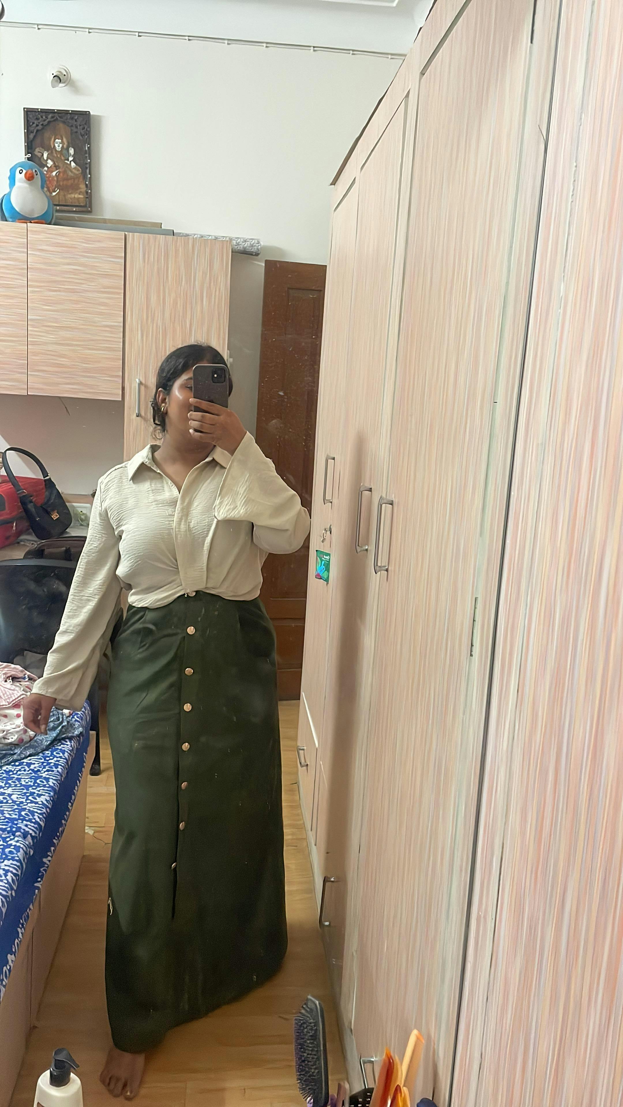 The Ironwood Green Co-ord Set is thoughtfully constructed with practical mechanisms for everyday comfort. The top features structured petal sleeves and a front button-down closure, providing both style and ease of wear. The skirt is designed with a comfortable waistband, incorporating a hint of elastic at the back for a flexible fit, and functional pockets add utility without compromising the refined silhouette.
