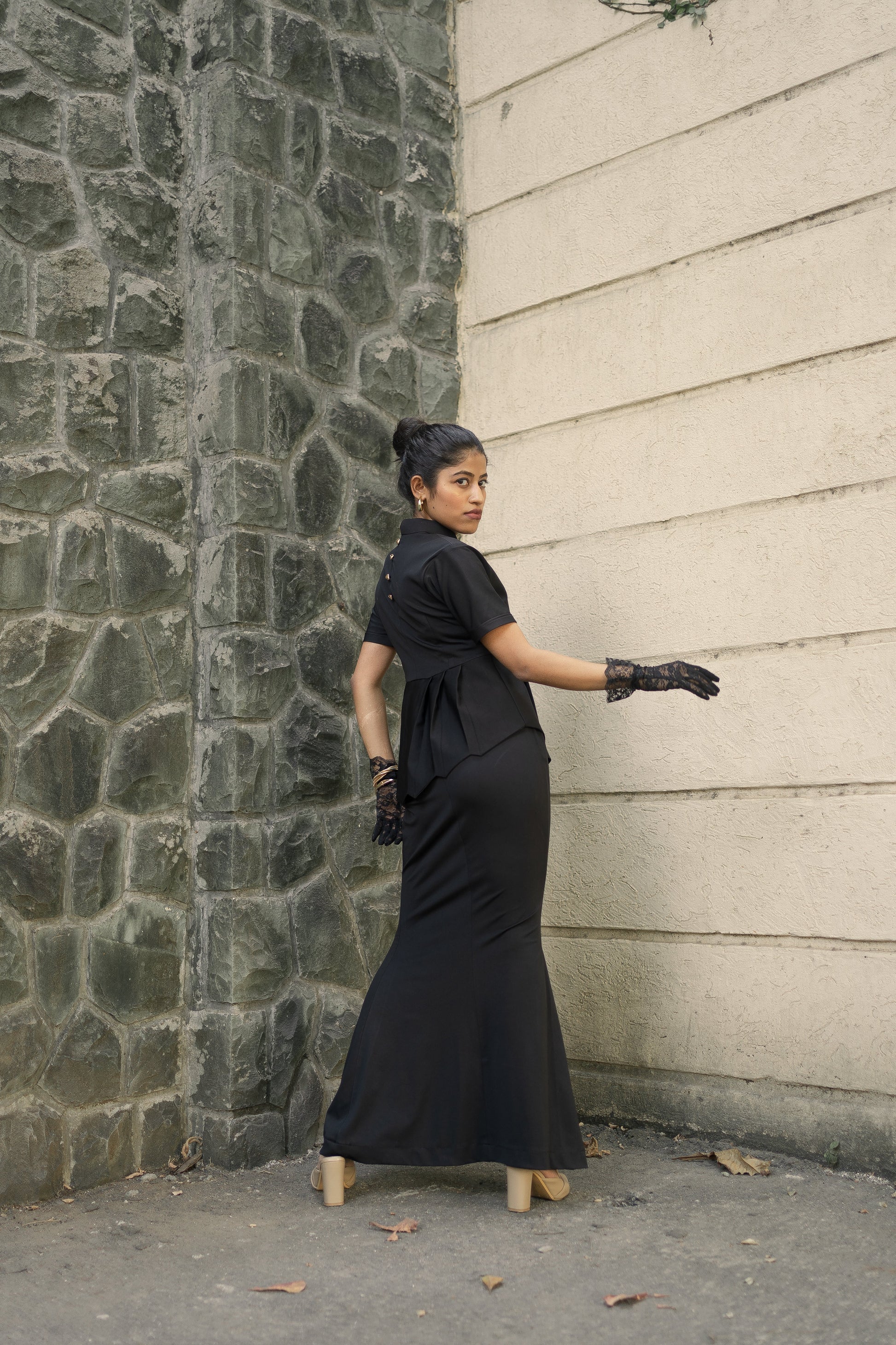 The Raven Black Peplum Top redefines power dressing with sculpted precision and graceful movement. Designed with a fitted bodice that cinches neatly at the waist before flaring into soft pleats, it strikes the perfect balance between sharp tailoring and feminine fluidity. The structured high neckline and short sleeves add a sophisticated, formal edge, while the back button detailing elongates the silhouette with subtle charm. Every line is intentional, creating a piece that flatters and empowers with ease.