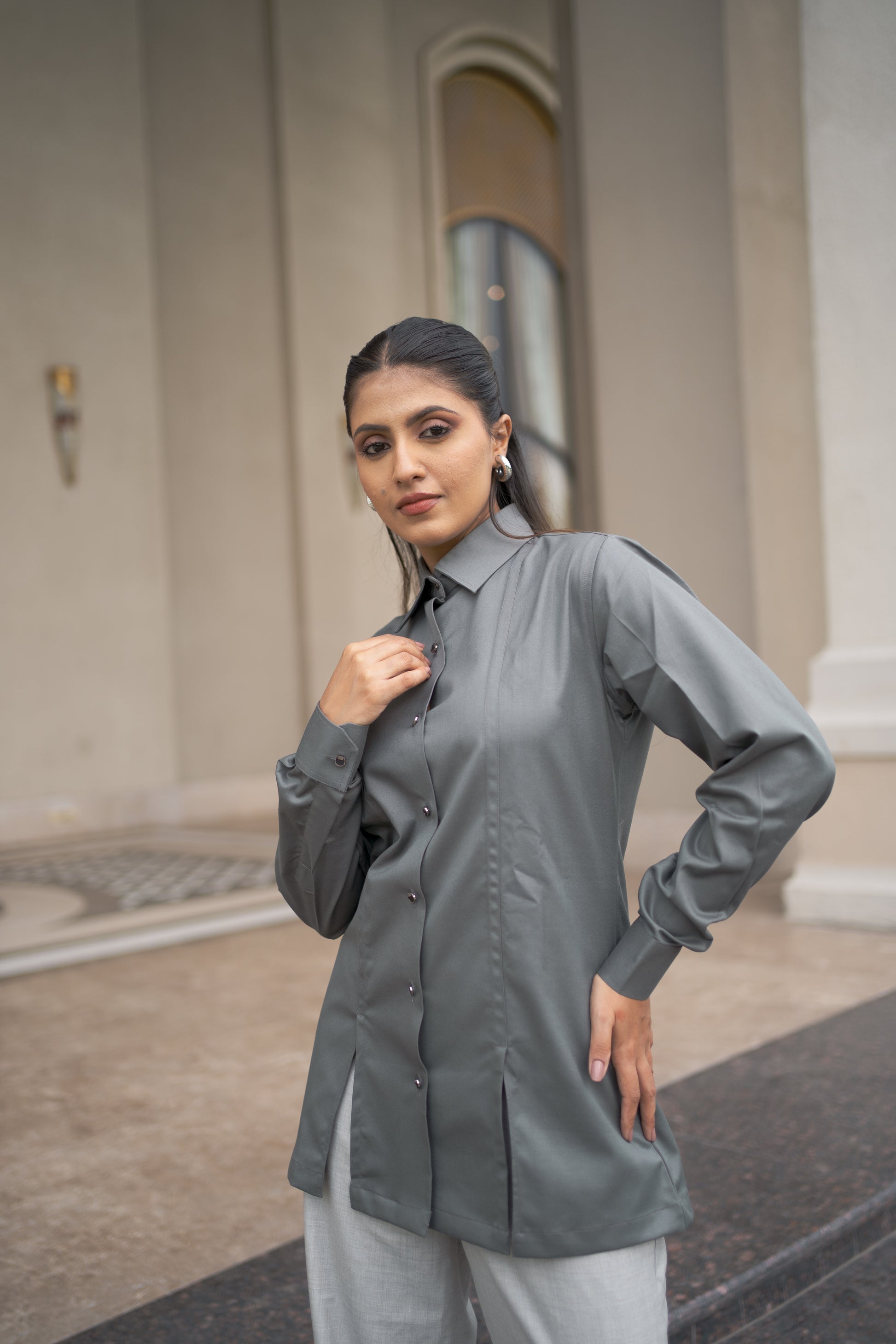 The Regal Ash Long Shirt offers effortless styling for both polished and relaxed looks. For everyday sophistication, wear it buttoned up and untucked with tailored pants or slim trousers to showcase its longline silhouette and subtle sheen. Style it as a lightweight jacket layered over a tank top or tee with jeans for casual weekends, or half-tuck the front into high-waisted trousers for a balanced, contemporary finish.