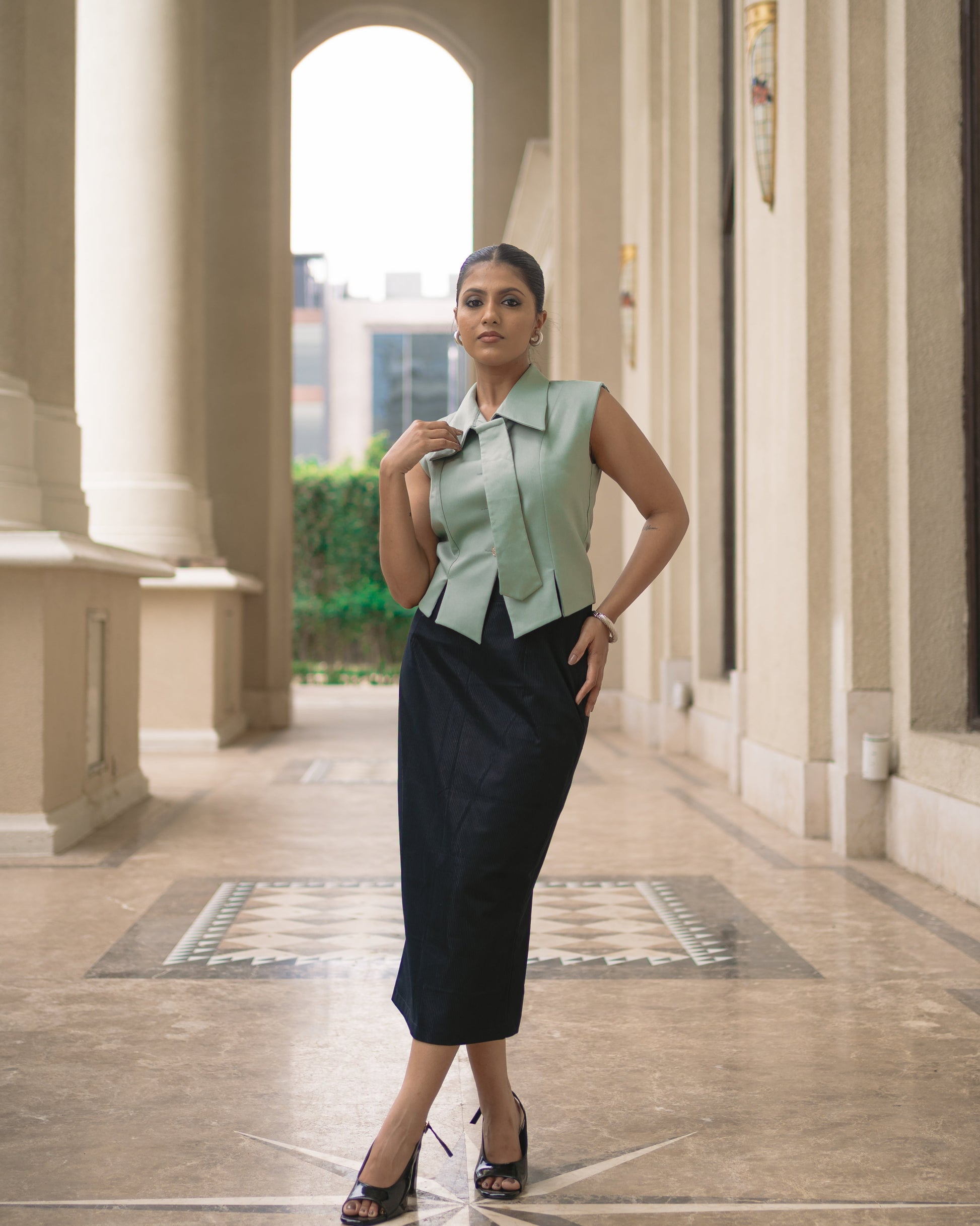 The Sage Green Waistcoat with Detachable Tie features a flattering sculpted silhouette that gently contours the waist and enhances the shoulders with clean, precise tailoring. The fit is body-skimming but comfortable, thanks to panel seams that follow natural curves and a statement collar that adds structure.