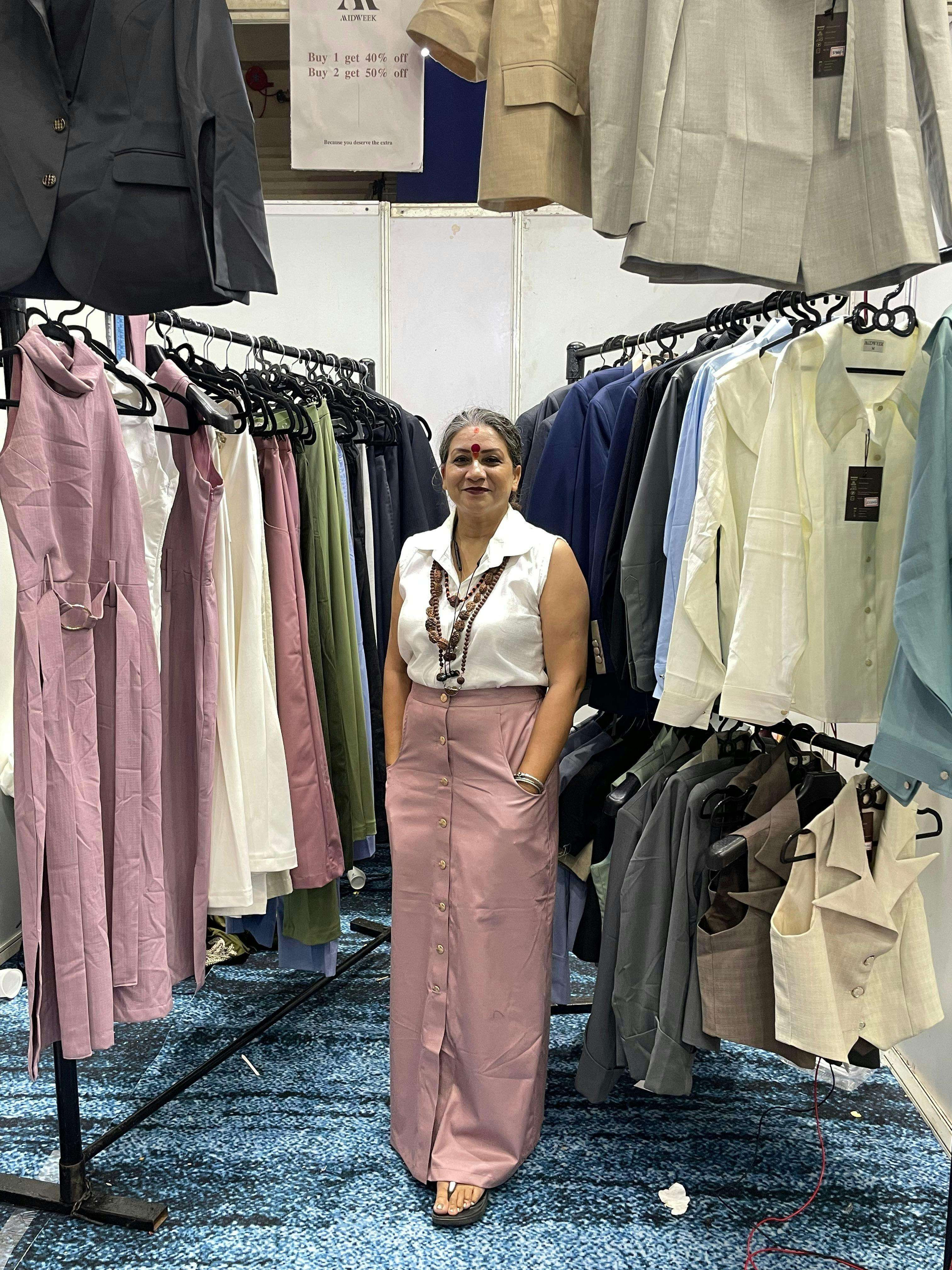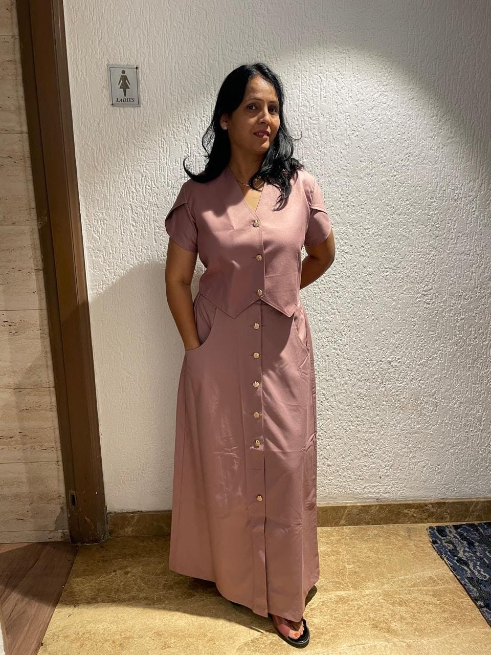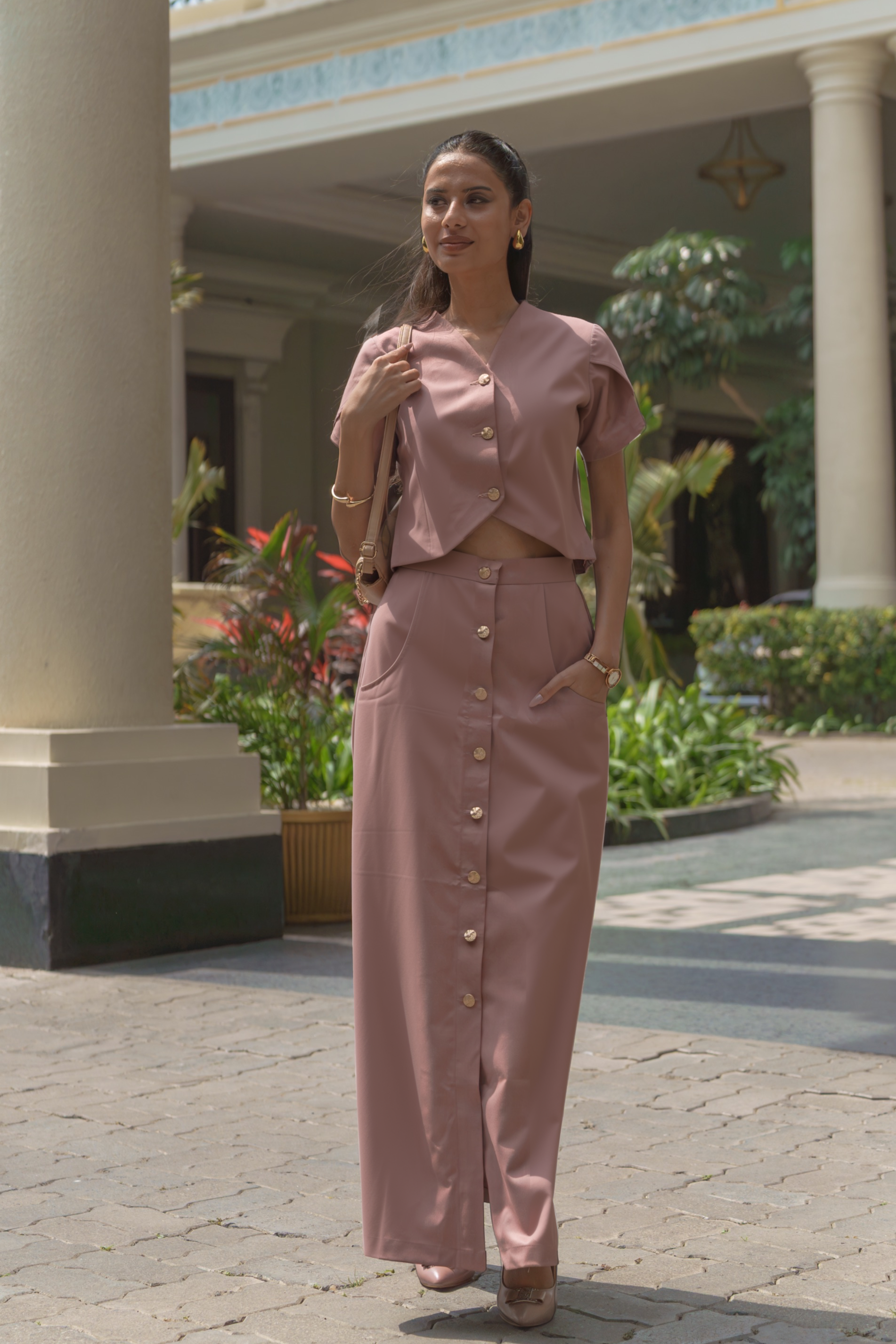 The Terracotta Blush Co-ord Set is thoughtfully constructed with practical mechanisms for everyday comfort. The top features structured petal sleeves and a front button-down closure, providing both style and ease of wear. The skirt is designed with a comfortable waistband, incorporating a hint of elastic at the back for a flexible fit, and functional pockets add utility without compromising the refined silhouette.